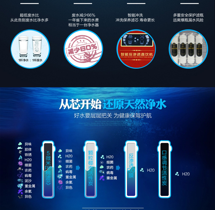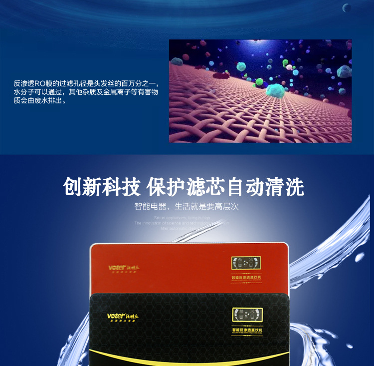 在一定压力下,水分子(H2O)可以通过ro膜,而原水中的无机盐,重金属离子,有机物,胶体,细菌,病毒和其他杂质则不能通过ro膜,因此部分水是可渗透的,通过ro膜分开,未渗透的水由于溶质的增加而形成浓缩水。